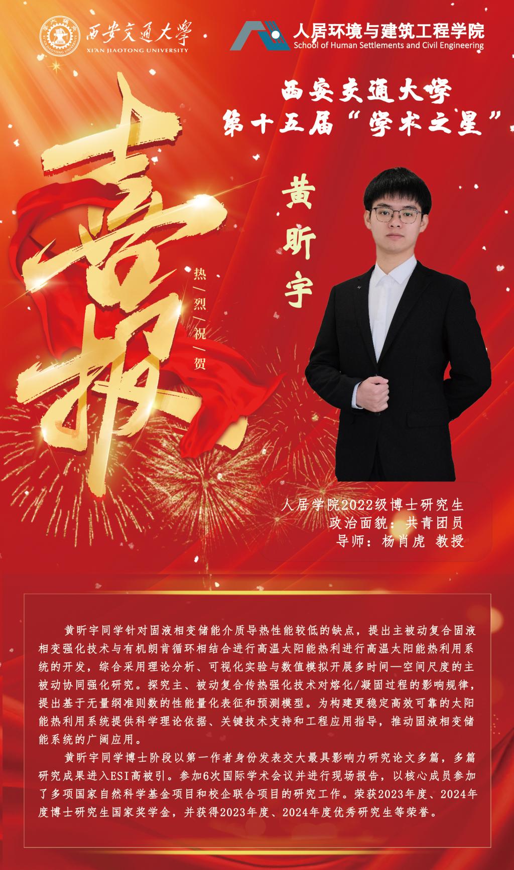 近日,西安交通大学第十五届“学术之星”评选活动由西安交通大学研究生院(党委研究生工作部)、共青团西安交通大学委员会主办,西安交通大学研究生会承办,各学院(部、中心)研究生会、博士生协会协办,以“研途逐星辰、科创谱新章”为主题,在全校范围内评选学术科技创新成绩突出的优秀博士、硕士研究生,通过树立先进典型,充分发挥榜样的力量,加深学术交流与互动,活跃研究生群体的科研创新气氛,提高研究生的整体科研水平。