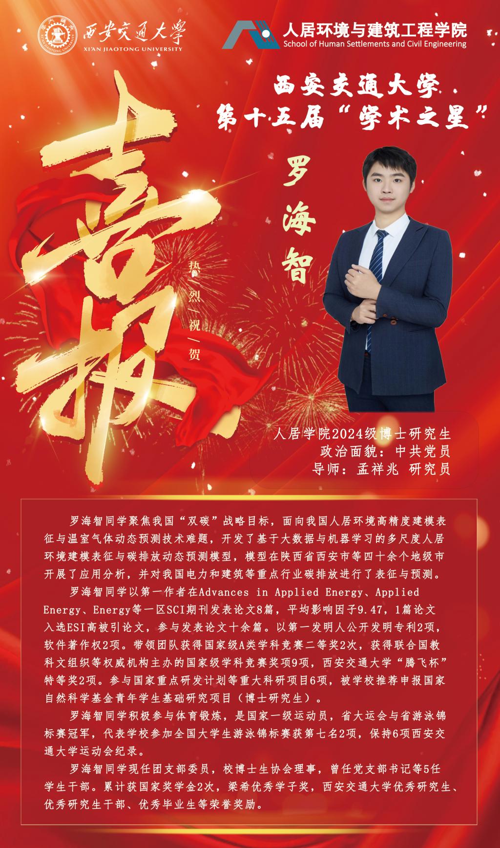 人居学院罗海智、黄昕宇两位博士研究生经过激烈角逐,最终获评西安交通大学第十五届“学术之星”,并且在网络投票及路演投票中,罗海智同学荣获“最佳人气奖”,黄昕宇同学荣获“最佳路演奖”,让我们一起欣赏两位同学的风采!