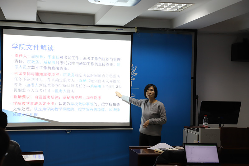 张硕英副院长通报学院为强化师德师风建设,强化考务管理出台的《本科生考务管理办法》,强调了加强考务管理、严格监考的目的,对具体实施办法进行了解读,并针对即将到来的期末开始,强调了相关注意事项。希望全院老师高度重视监考工作,落实工作,营造健康的复习和考试氛围。