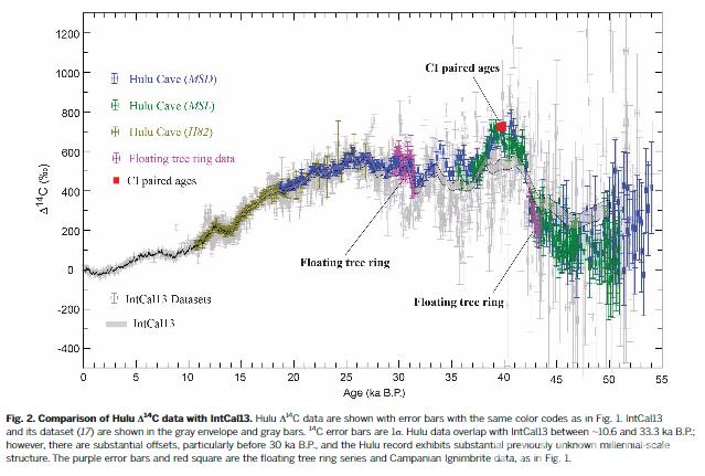 本研究利用中国南京葫芦洞的两支石笋首次将石笋Δ14C记录拓展至过去5.4万年,涵盖了14C测年方法的整个年龄范围。该记录位于International Calibration2013(IntCal13)所采用的基本数据变化范围的中间值附近,具有很高的可信度。对于老于30 ka BP的时段,新葫芦洞Δ14C记录与IntCal13有一定不同(见上图)。本研究进一步证实了Δ14C的千年尺度变化主要受地磁场控制,例如两次著名的古地磁变弱事件(Mono Lake Excursion和Laschamp Event)均造成了Δ14C的异常高值。除此之外,研究者还发现千年尺度气候变化引起的碳循环变化也会影响Δ14C变化。研究认为,25-11 ka BP期间Δ14C值长期减小的变化趋势很可能与海洋通风逐渐增强有关,但这仍需要未来进行更加深入的研究。
