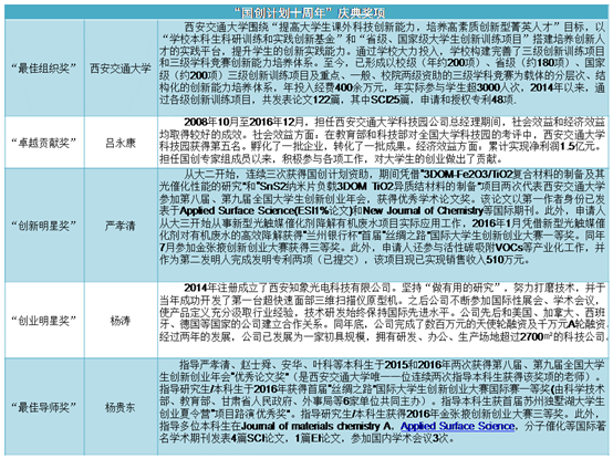 今年时值国创计划实施十周年,以“砥砺十年·星火燎原”为主题,教育部自今年4月启动了“国创计划”十周年荣誉奖项的评选工作。包括来自澳门特别行政区在内的全国236所高校和韩国蔚山大学等海外高校的师生代表,教育部、地方教育主管部门代表,国家级大学生创新创业训练计划专家组、协作组成员,教育部创新方法教学指导分委会成员、专家,社会各界人士约1300人参会。最终从全国近千所高校中评选出21个卓越成就(功勋/贡献)奖、6个创新明星奖、5个创业明星、19个最佳导师奖、22个最佳组织奖,西安交大获包揽“最佳组织奖”“卓越成就(功勋/贡献)奖”“创新明星奖”“创业明星奖”“最佳导师奖”等全部单项奖,获奖数量居全国首位。