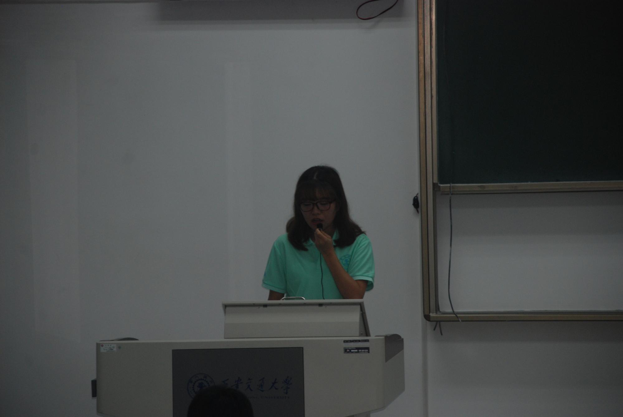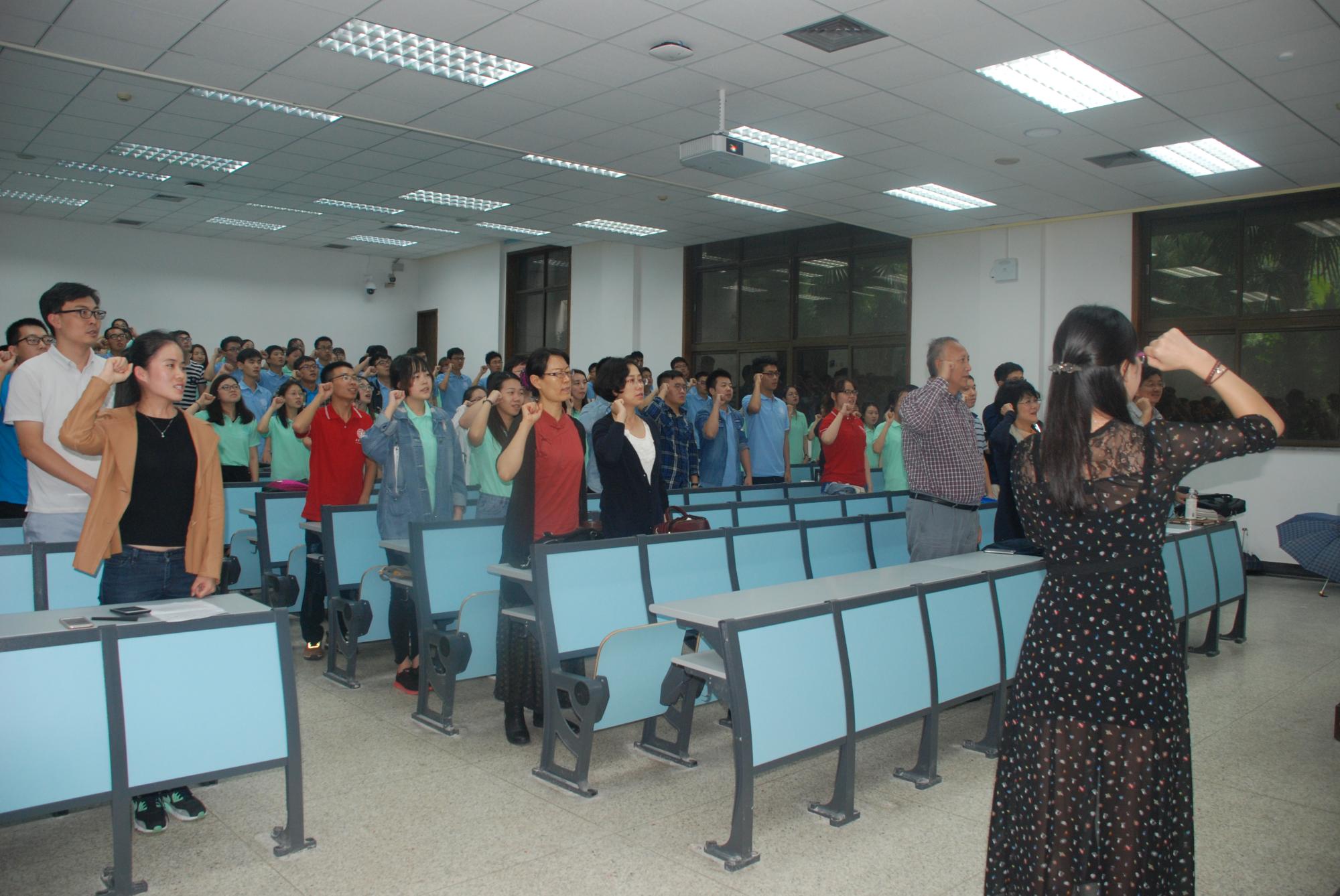 在贺沅平学姐领诵,全体研究生起立庄严宣读校训声中,新生入学教育大会前半程落下帷幕。随后教务员郭愔老师和辅导员汪毅香老师对研究生教学管理工作、学生工作、学院学生文化活动、学院日常行政管理、安全知识和心理健康知识进行介绍和讲解普及。
