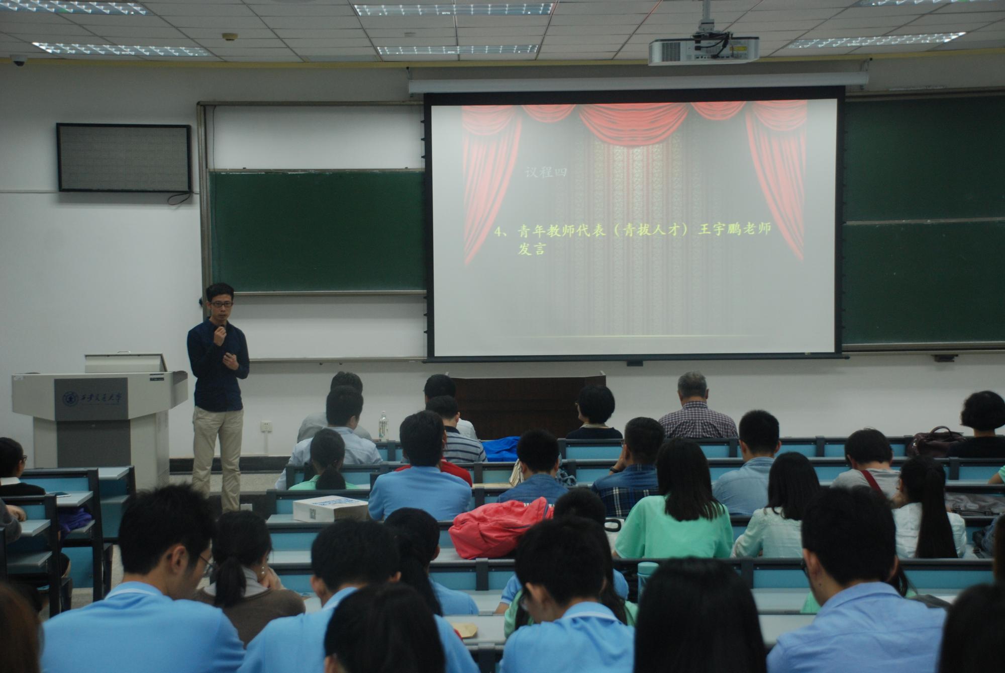 青年教师代表(青拔人才)王宇鹏老师向大家分享了科研旅程,他用一句“我们一路拼搏,不是为了改变世界,而是让世界不要改变我们。”来勉励大家不忘初心,记得此刻的心情,持之以恒,怀抱一个开放的心态去勇于尝试,勇于拼搏,全力以赴地实现自己的梦想,创造新的科研成果。