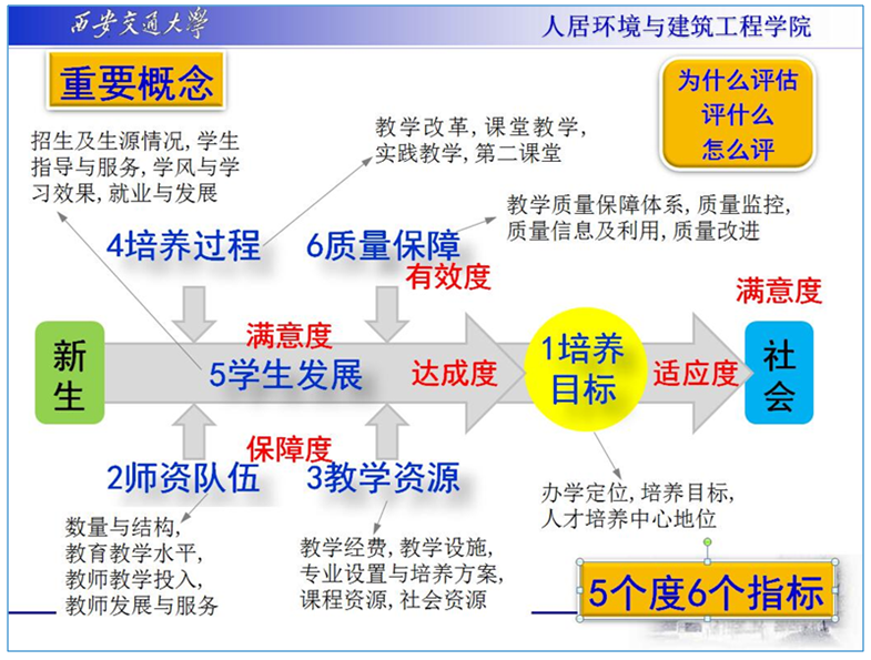 第二,强调了最近围绕评估工作全体教职员工应该重点学习的材料,包括评估《应知15条》、学校自评报告、学校重大教育教学改革文件等,并逐一做了解读。其中,对《应知15条》的学习应注重评估指导思想,明确为什么评估、评什么、怎么评,通过评估“5个度”和“6个指标”的关系示意图,加深老师们对评估内涵的理解。