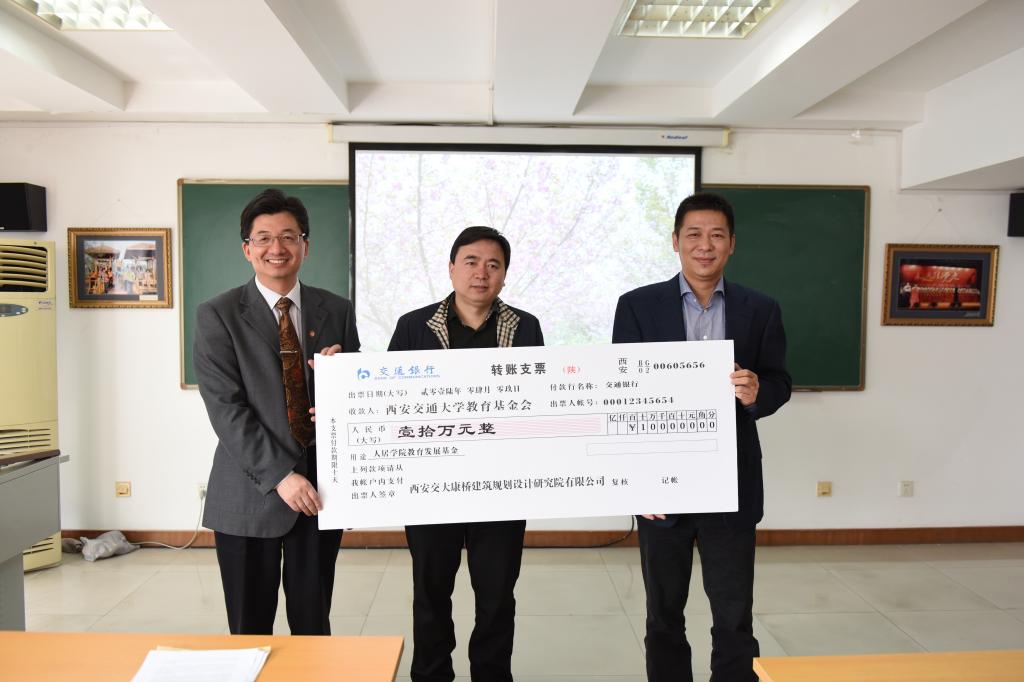 在西安交通大学120周年暨西迁60周年华诞之际,交大康桥设计院为回报人居学院多年来的帮助和支持,特提供10万元的教育发展基金,支持人居学院的学生国际化交流和教学改革。