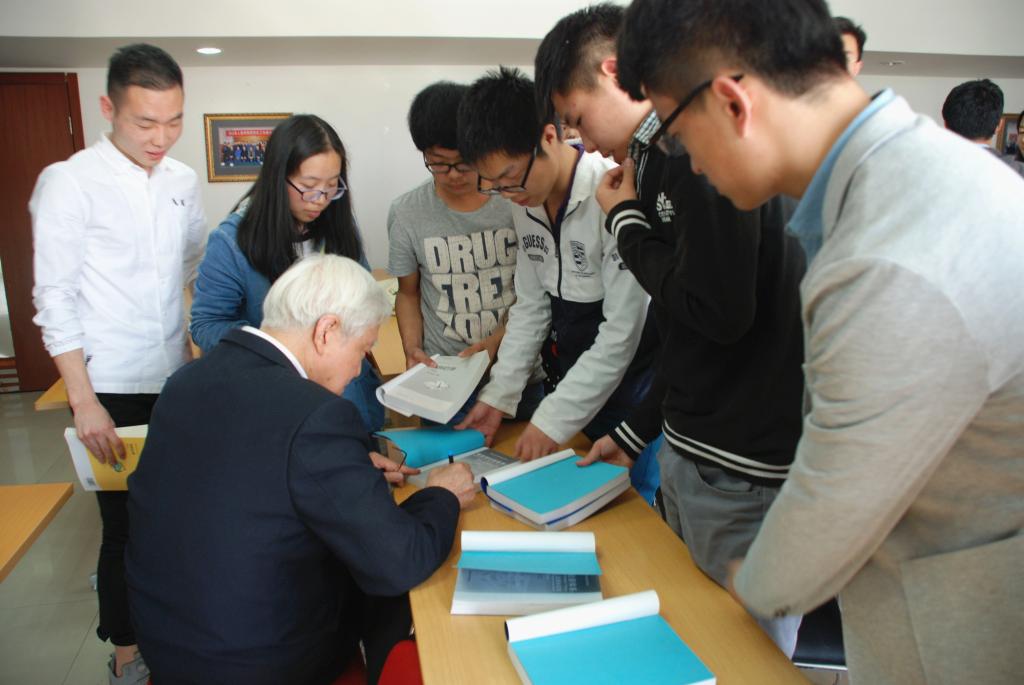 俞茂宏教授将自己的20本专著亲自赠予了土木工程系各年级共20名品学兼优的学生代表,鼓励他们努力学习,早日成为国家建设的栋梁之材,并为同学们在每本赠书上进行签名留念。赠书仪式后,俞茂宏教授为与会的老师和同学们做了精彩的学术报告,讲述了他在解决工程实际问题过程中的经历,介绍了创建“双剪统一强度理论”的基本思想,分享了在人民大会堂领取国家自然科学奖二等奖的体会。报告期间,俞茂宏教授与同学和老师们精彩互动,不时走到同学跟前亲切交流,现场气氛轻松、热烈。