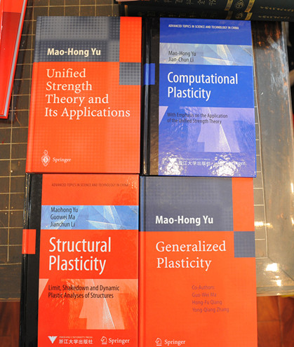 言谈之间,俞教授起身在书柜里拿出了他近几年完成的几本著作,令人惊讶的是这几本基础理论性书籍全都是英文撰写,由世界知名出版社Springer出版,更令人欣喜的是俞教授的“双剪应力强度理论“已经被写进了水利百科全书第二卷,这是对其研究成果的巨大肯定。