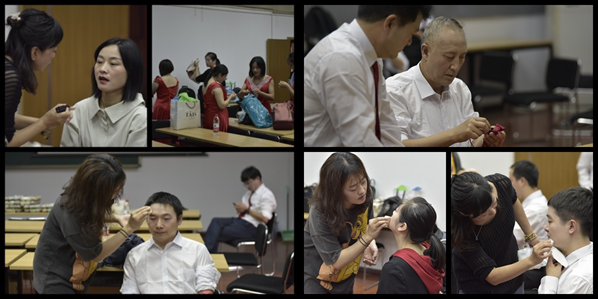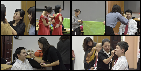在演出前的4个小时,合唱队的成员就开始准备,换服装、化妆、彩排……为了能呈现出好的舞台效果,大家都倾尽全力投入筹备工作中。参与活动的老师们,有学院书记、院长、有德高望重的知名教授,有意气风发的青年才俊……这一刻,大家都相互帮助、相互配合,只为呈现一场精彩绝伦的表演。