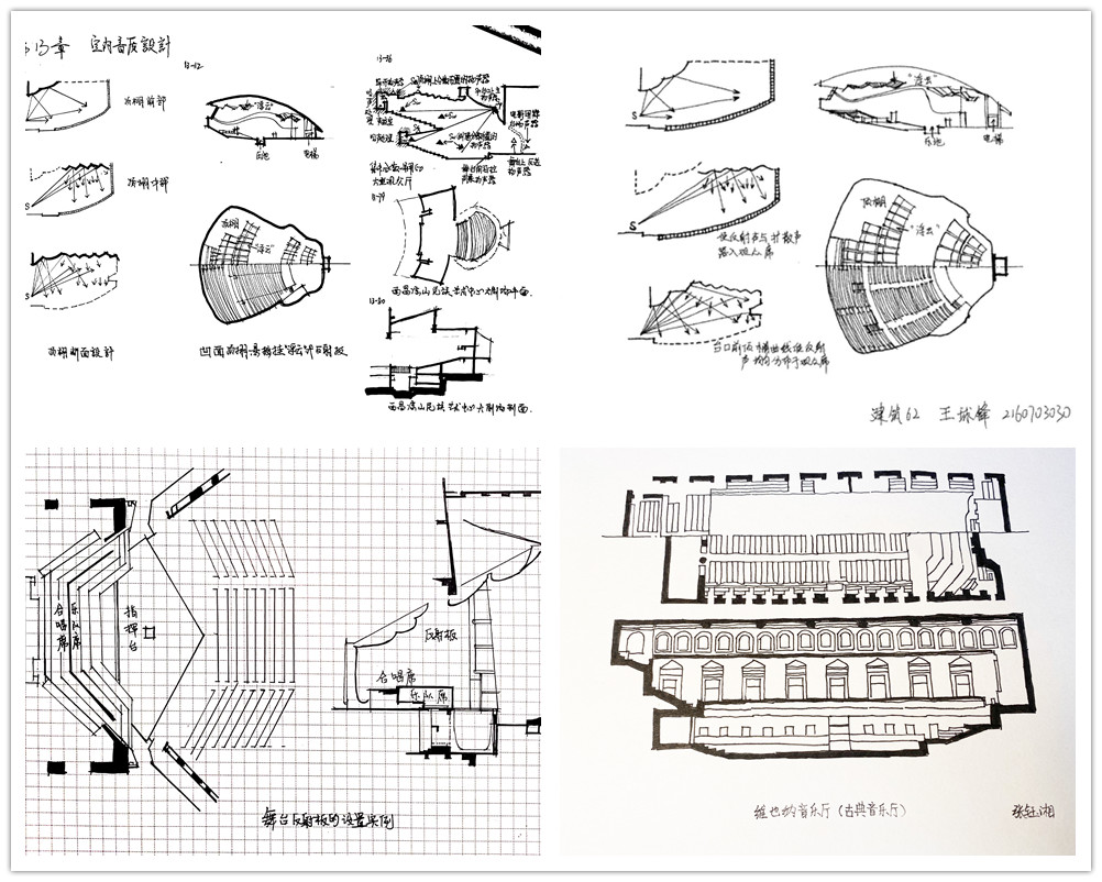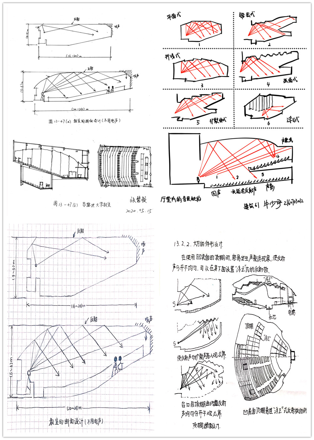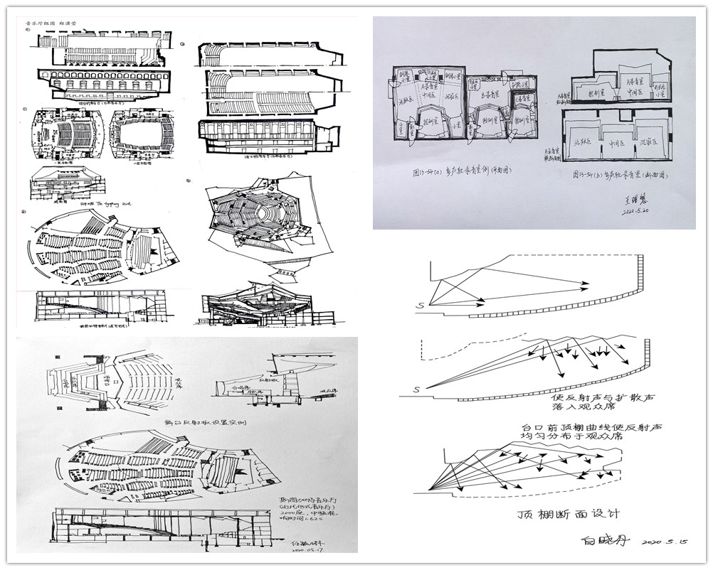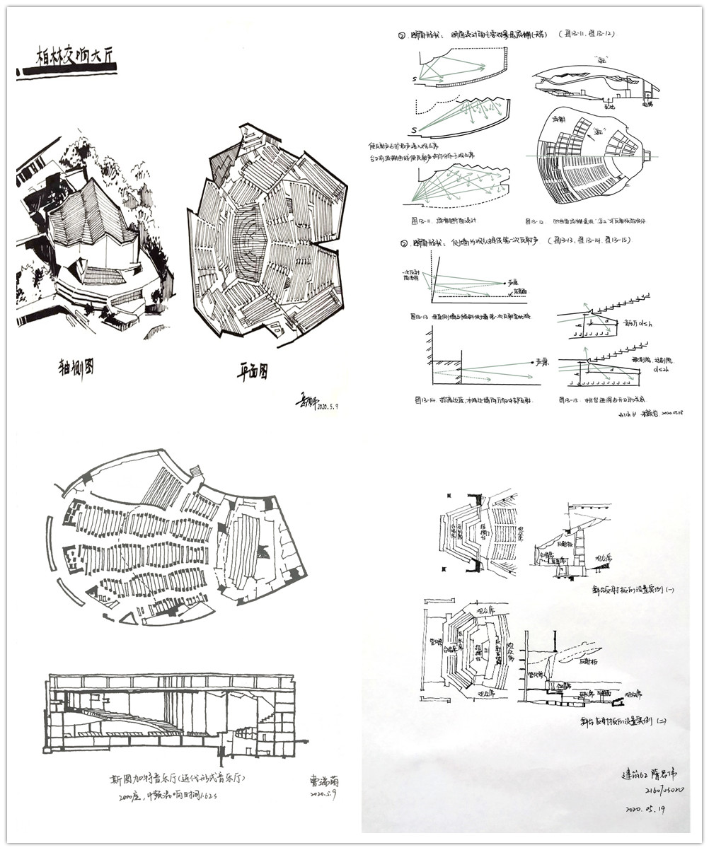 正如学生吕朝阳在课后感悟中谈到,2020年,建筑声学课程采用了线上授课,借助网络平台使我们尝试了一次全新的课堂模式。在课堂上,老师从主导者变为引导者,学生成为课堂的主角,在老师的引导下,同学们积极展开对建筑声学知识和学术研究方面的思考。在课堂上,相较于课本上的知识,我觉得收获更大的是对学术研究的逻辑体系有了更深入的了解,我们学会了如何更加深入全面地分析问题、解决问题。在对建筑声学笔记的抄绘过程中,我体会到了严谨的科学公式和建筑的艺术美学之间的联系,对建筑学科有了更加深刻的认识。