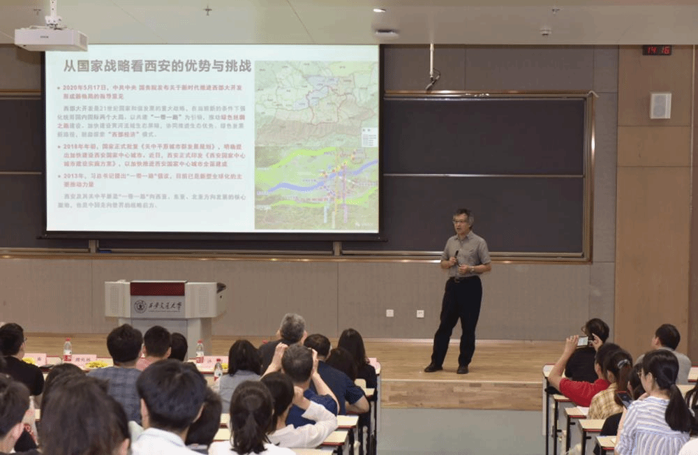 董卫教授就国家新战略与西安新机遇,探讨关中历史文化空间保护与发展。报告从国家战略层面梳理了关中地区的优势和挑战,分析了世界自然、文化遗产中亚洲大河文明的地理分布、西安作为“一带一路”战略前沿与腹地的双重角色,指出自然资源与历史文化资源整合、非物质文化遗产与物质文化遗产的整合,是国土空间规划时代历史文化空间发展的必由之路。报告提出了关中-中原地区文脉与“城陵一体”的自然-文化资源一体化的城乡空间大格局。董卫指出学习历史不仅是向后看,更是要向前看,希望同学们具有更广阔的国际视野,思考全球背景下的自然和文化遗产保护议题。