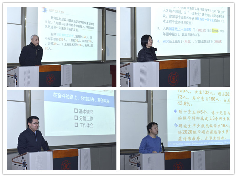 周典副院长、许领副院长、张硕英副院长、王新轲副书记分别就2020年学院人才队伍建设、研究生教学、本科生教学、学生工作进行了总结汇报和问题分析,并对2021年工作计划进行了通报。王新轲副书记还就师德师风建设进行了宣讲。