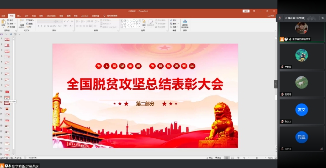 2021年2月28日,人居学院2020级学硕党支部在腾讯会议召开2月份组织生活会,共同学习讨论党史学习教育动员大会及全国脱贫攻坚总结表彰大会的相关内容。会议由党支部书记李鹏扬同志主持,支部全体党员及入党积极分子共22人参加会议。