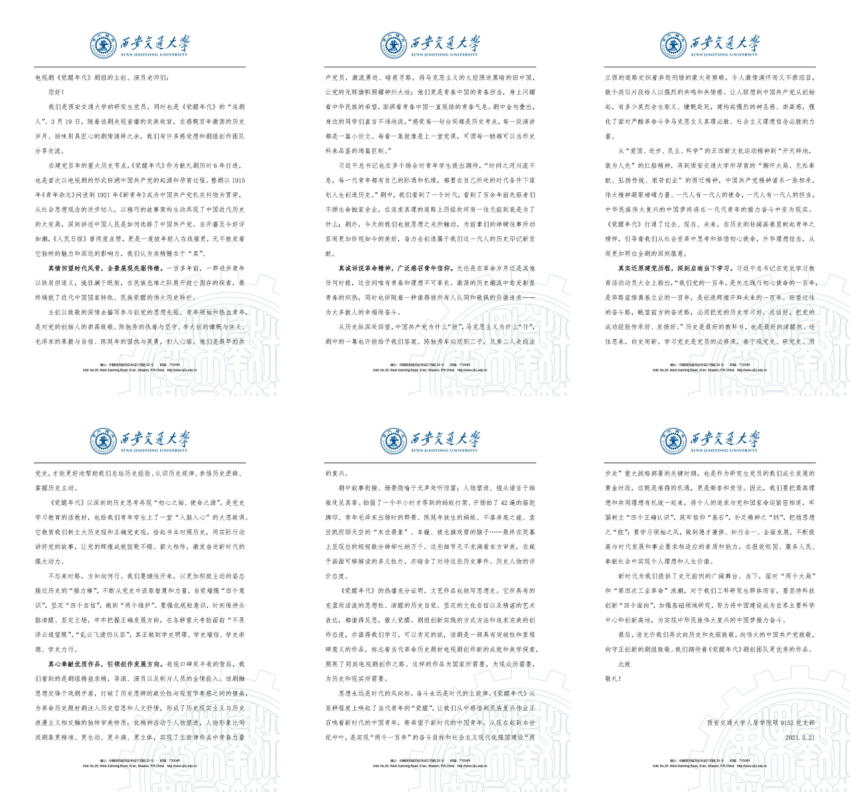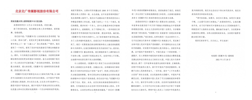 3月21日,国家广播电视总局“理想照耀中国”庆祝中国共产党成立100周年电视剧展播重点剧目——《觉醒年代》在央视一套黄金时段播出刚刚收官,我校人居学院硕9152党支部的研究生党员们在感慨百年激荡的历史岁月、回味别具匠心的剧情演绎之余,致信剧组分享“追剧”所感受的强烈情感共鸣和深刻爱党爱国教育。