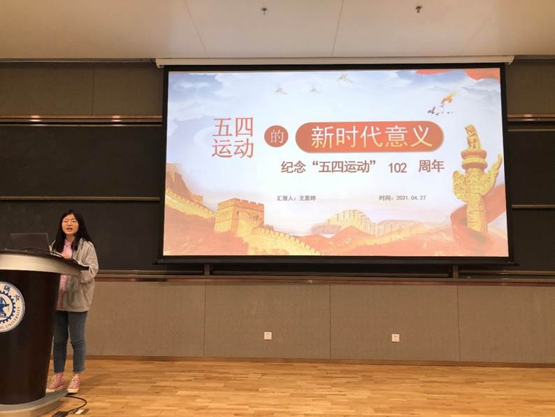 在谈到“五四”运动的新时代价值时,王紫婷同志强调,五四运动是我国近代发展历史上具有里程碑意义的重大事件,这一运动中所创造出的五四精神是五四运动中宝贵的精神财富,在百年后的今天依然是我们不可多得的珍贵的财富。作为青年学生的我们,更要以五四精神为启发点,当代我们生存发展的环境要比五四时期更加优越,我们无时无刻不享受着改革开放和经济快速发展带来的硕果,但我们尽管生活在和平年代,还是要同五四时期的青年一样具有爱国的热忱,做坚定的爱国者。要让祖国的上空始终飘扬着我们高举的爱国主义旗帜。