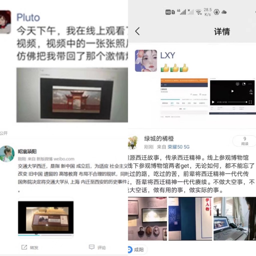 除了在班级和支部内部展开热烈的讨论,同学们还纷纷利用社交工具以主人翁的情怀对外宣传和传扬西迁精神。2021级专硕班同学们自发在微博和朋友圈打卡西迁博物馆,抒发对西迁精神的认同和感想。