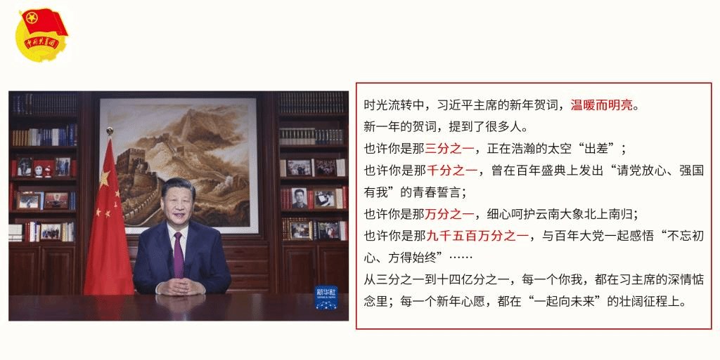 第一部分全体成员认真观看习总书记二〇二二年新年贺词,在中国发展的历史银河中,中国声音、中国瞬间、中国故事不断告诉我们:再大的困难,除以14亿,也必将被克服;再微小的力量,乘以14亿,也必将势不可当。