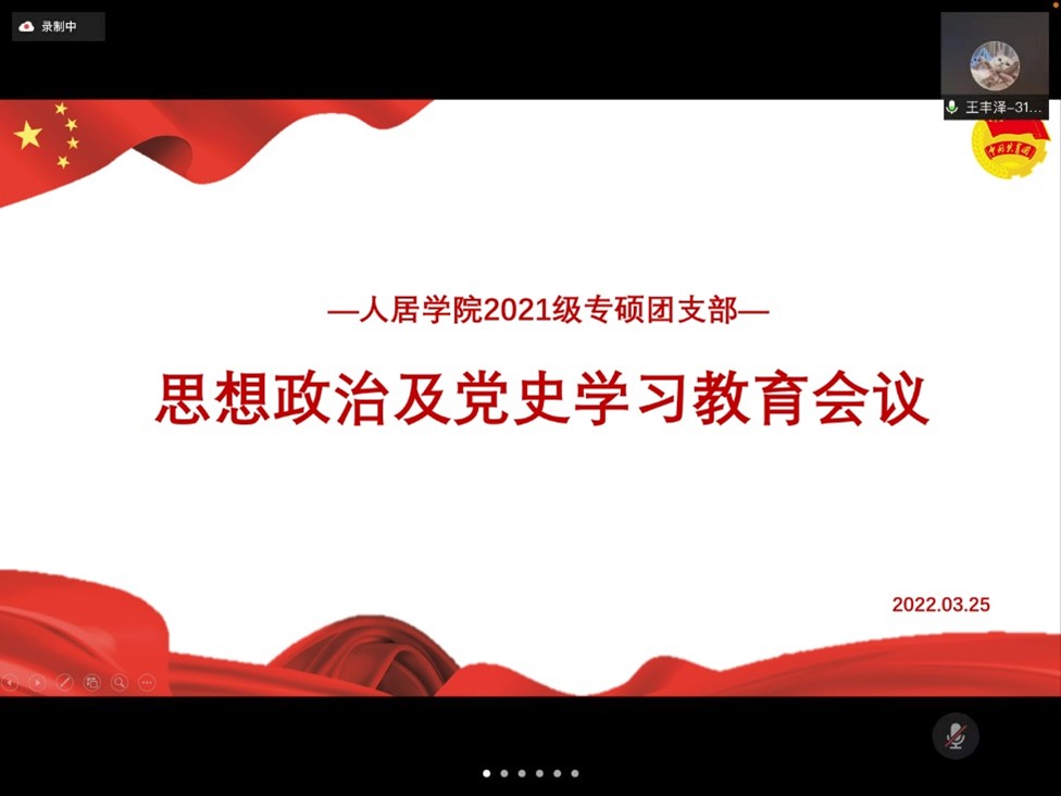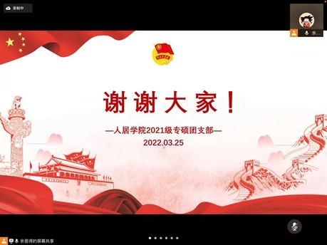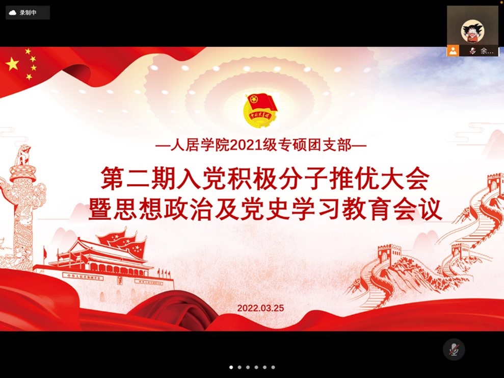 为响应国家优秀人才入党战略与我院党支部的号召,贯彻落实党建促团建的工作,加强入党积极分子队伍建设,积极为党组织输送优秀团员作为党的培养对象,并贯彻落实中共中央办公厅《关于推动党史学习教育常态化长效化的意见》的指示,着眼增强个人理论自觉,坚持不懈用习近平新时代中国特色社会主义思想武装头脑。2022年3月25日20:00,人居学院21级专硕团支部于线上召开“第二期入党积极分子推优大会暨思想政治及党史学习教育会议”。本次会议由团支部书记余恩得同志主持,支部75人参加。