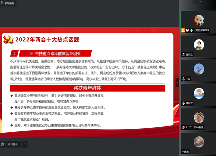 会议第一项,王路带领大家学习了2022年全国两会社会调查结果,回顾了两会十大热点话题以及热点关注问题,“依法治国”最受关注,“从严治党”热度不减,“社会保障”也备受期待。民生无小事,枝叶总关情。习近平总书记强调,要在推动社会保障事业高质量发展上持续用力,织密社会保障安全网,为人民生活安康托底。