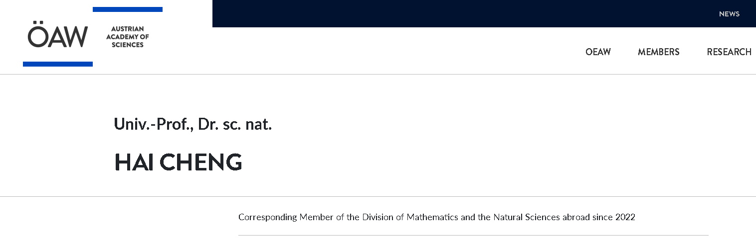 奥地利科学院(The Austrian Academy of Sciences,OeAW)建立于1847年,是奥地利从事自然科学和社会科学基础研究的最高研究机构,下设数学自然科学和人文社会科学两个学部,主要研究领域是物理、航天、地学、生物、医学、历史和语言文学等,成员均为在自然科学和人文科学领域取得重大成就的专家,具有重要学术影响力。奥地利科学院下辖25个研究所,目前共有院士770余人,每个学部包含正式院士、荣誉院士及通讯院士?;诔毯=淌谠谟讼挡饽昙际鹾腿蚱虮浠芯苛煊虻慕艹龀删秃脱跎Р吭菏客萍觥⑵酪?,增选程海教授为2022年度奥地利科学院数学自然科学学部外籍通讯院士。