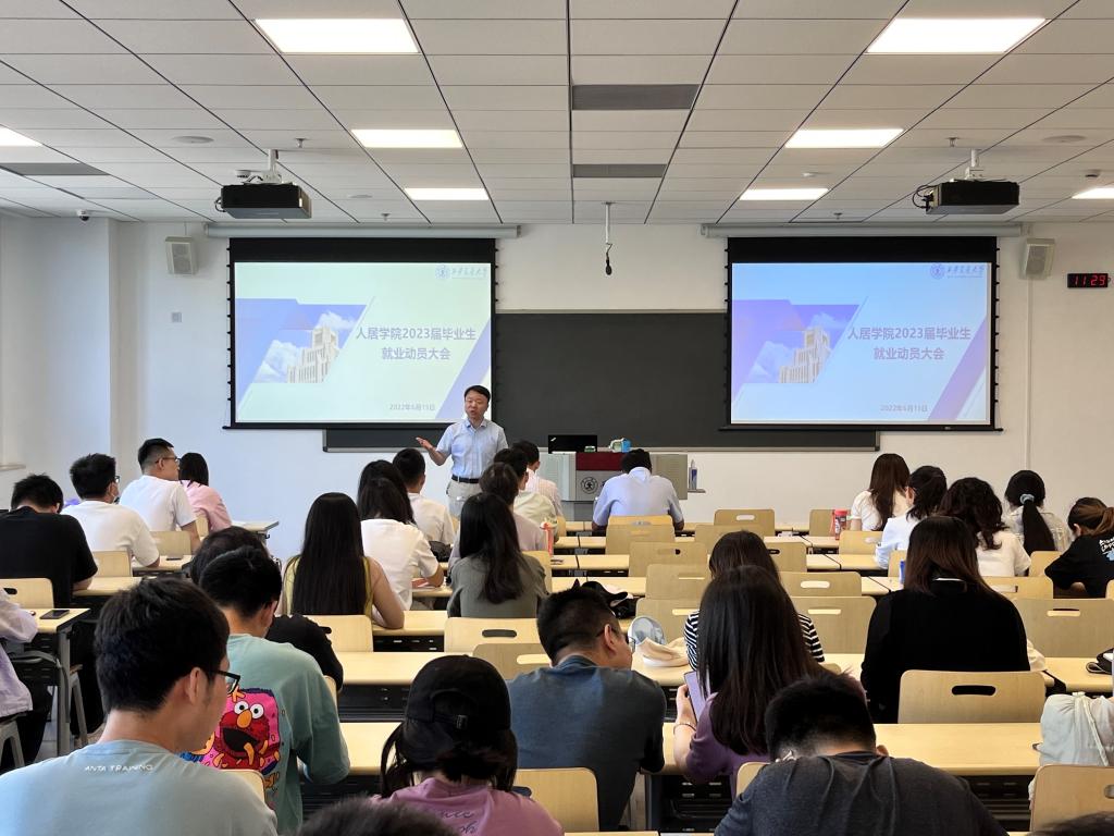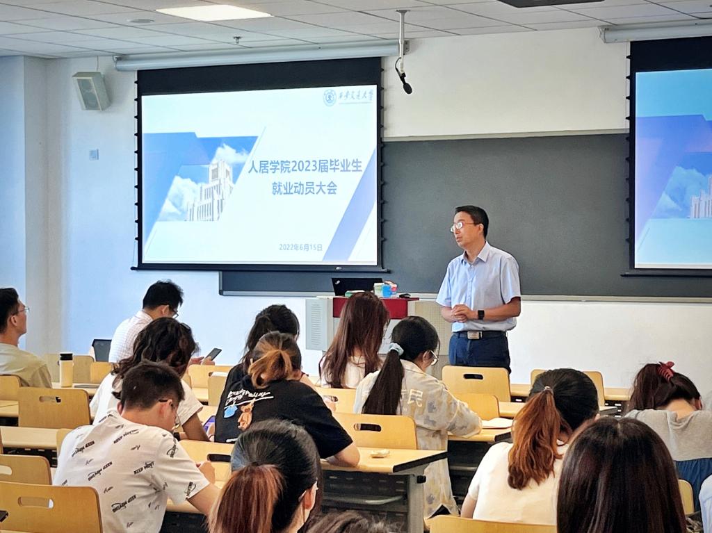 为帮助人居学院2023届毕业生了解就业形势,推动实现积极就业、尽早就业、高质量就业,6月15日上午,人居学院采取线上、线下相结合的方式,召开2023届研究生毕业生就业启动会。会议邀请就创中心副主任沈人杰作就业指导,人居学院党委书记杨鹏、党委副书记王新轲、辅导员杜文静及全体2023届毕业生参会。