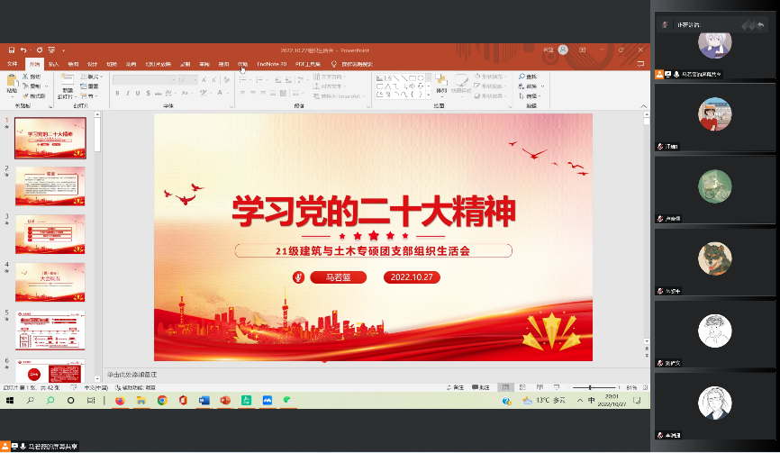 为深入学习宣传贯彻党的二十大精神,重温中国共产党百年奋斗历程,传承红色基因,人居学院2021级建筑与土木专硕团支部于2022年10月27日晚通过线上方式开展了“学习党的二十大精神”主题团组织生活会。会议由团支部书记马若篮主持,共47名支部团员参与。