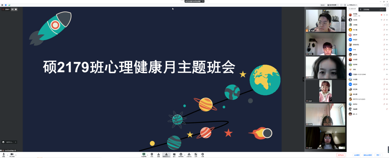 为响应研究生新生心理健康月主题教育活动的号召,进一步加强班级建设,增进学生自我了解,2022年12月18日,人居学院硕2179班组织召开心理健康主题班会?;嵋橛砂喑なυ罂鞒?。