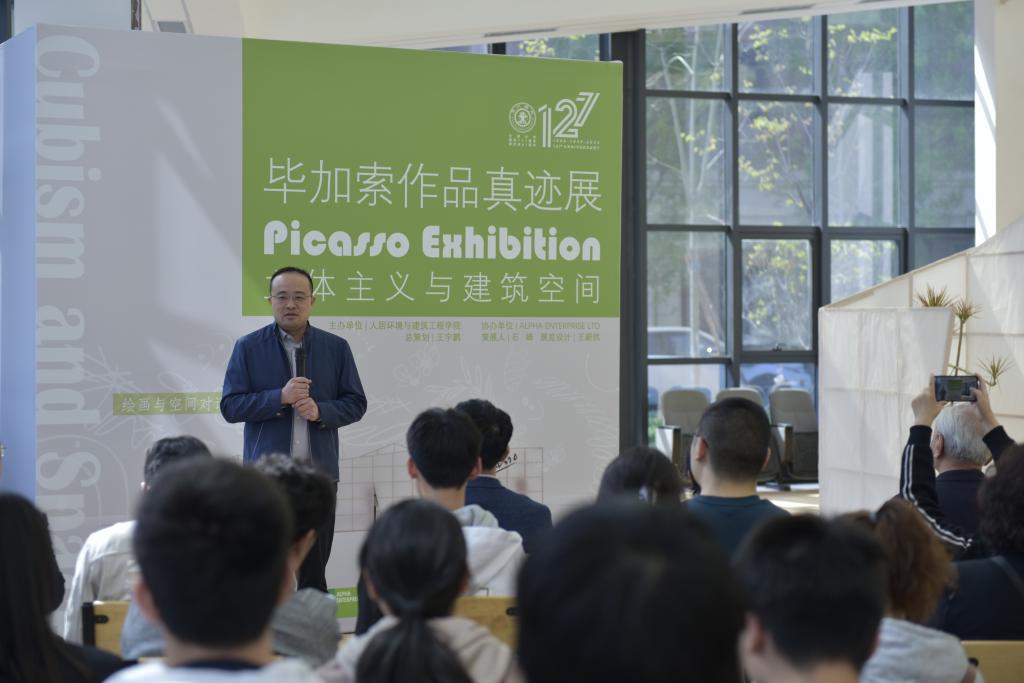 人居学院副院长、建筑学系教授周典讲话。他表示7号楼(源居楼)既是实验性建筑,又是产学研合作平台,该楼规划了建筑绿色节能系统,全面应用建筑光伏一体化,建成后将成为绿色建筑在高校园区应用的典范。绿色建筑代表着建筑发展的未来方向,拥有巨大的科研价值和发展潜力,将为人居学院未来学科发展提供巨大的支撑。打破传统、创新是毕加索作品的主要特点,希望以此活动为开端,建筑学系和人居学院师生能在创新中结出更多科研硕果。