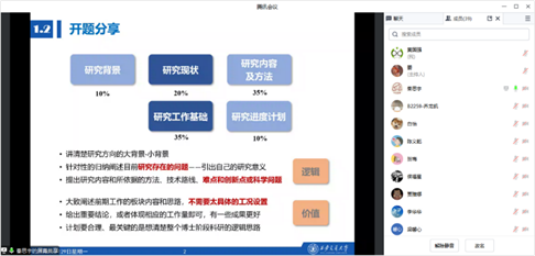 最后,由B2071班优秀博士生代表秦思宇同学向班级同学分享学位论文开题报告、中期报告经验和答疑,让博一、博二同学们对学位论文开题、中期过程有了清晰的了解,缓解同学们对开题、中期过程的焦虑。