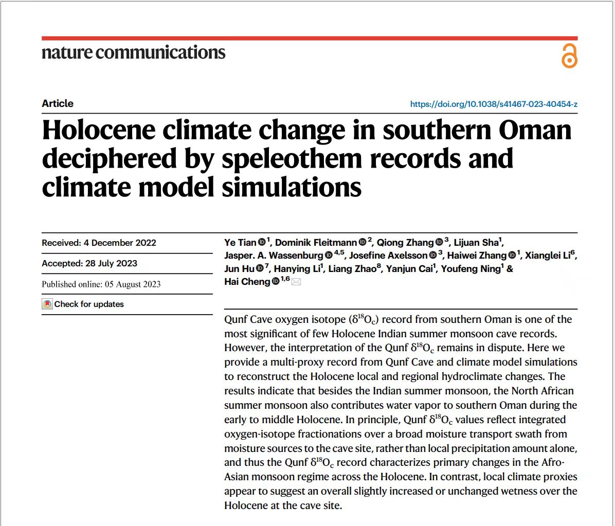 该工作以《石笋多指标记录和气候模拟重建阿曼南部全新世气候变化》(“Holocene Climate Change in Southern Oman Deciphered by Speleothem Records and Climate Model Simulations ”)为题在《自然通讯》(Nature Communications)发表。文章第一作者为西安交通大学全球环境变化研究院博士研究生田野,西安交通大学全球环境变化研究院程海教授为通讯作者,西安交通大学全球环境变化研究院为该论文通讯作者单位。该研究成果是全球环境变化研究院程海教授团队的又一重要进展。该工作得到了国家自然科学基金的支持。瑞士巴塞尔大学、瑞典斯德哥尔摩大学、韩国釜山大学、中国科学院地球环境研究所、厦门大学、南京师范大学等个人或团队为本工作提供了研究支持。