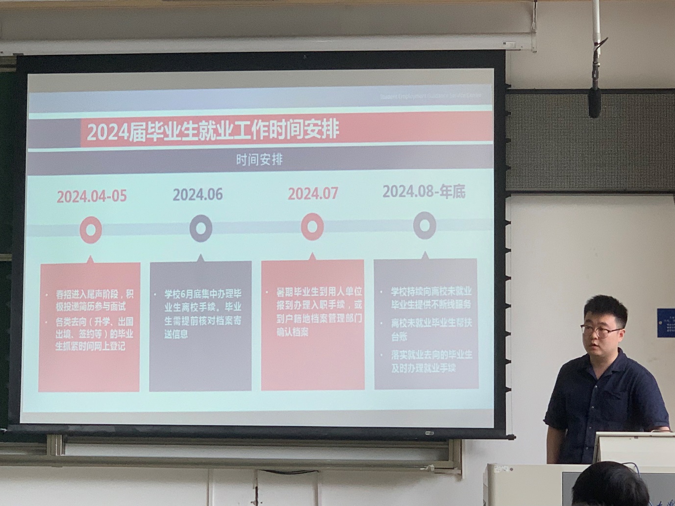 人居学院邀请到就业创业指导中心吴佳琦老师,为大家介绍了就业工作的时间安排工作,详细讲述了春秋招等重要时间节点的准备,以及各类企业的宣讲会举办时间段。吴老师还就毕业生的就业相关政策和流程,本科生的档案、个人信息、存档等问题进行了宣讲,提醒大家要重视毕业去向登记。在毕业季中,如果遇到了相关就业问题,可以在就业信息网站上获得帮助、完成相关手续。