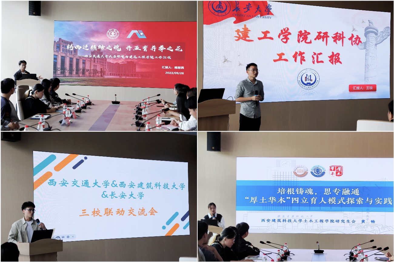 在交流研讨环节,人居学院研会陈思民、长安大学建工学院研会王斌、研科协王琰、西安建大土木学院研会黄畅分别就各自部门的亮点工作和特色活动作了报告。人居学院研会大力弘扬“听党指挥跟党走”的西迁精神,围绕三全育人、五育并举,充分展现了心怀家国、不懈奋斗的人居形象。长安大学建工学院研科协建立“科协+党支部”创新模式,研会精准化组织学生工作,标准化开展党建工作,切实为学生办好事、办实事、解难事。西安建大土木学院开创性地提出了“厚土华木”四立育人模式,通过实践活动服务青年、感召青年、引领青年,以厚植立德,以土培立学,以华育立志,以木撑立业。随后,三校研究生就联办学术论坛、开展跨校研学、进一步加强联动等内容进行了深入交流研讨,思考深入、见解独到、氛围热烈,充分体现了三校研究生昂扬向上的精神面貌。