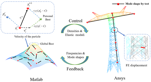 针对该问题,孙清教授团队提出了一种基于振动测试的大型特高压输电塔结构动力特性分析和有限元模型修正框架。开展了基于传感器优化布置准则的输电塔结构环境振动测试,获得了微幅振动下结构关键部位加速度响应时程。采用快速贝叶斯傅里叶变换方法,识别并量化了真型塔结构的动力特性参数及其后验不确定性。发展了一种基于粒子群算法的交互优化方法,修正有限元模型的质量及刚度分布。研究结果表明,有限元模型交互优化分析框架可以有效地应用于输电塔结构,模型误差由33.55%降低至5.38%。该成果有助于拓展有限元模型的应用范围,揭示环境耦合作用下输电塔结构的静动力行为和演化规律,为大型特高压输电铁塔结构灾变机理、健康监测等方面的深入研究提供可靠的理论依据与技术支撑。