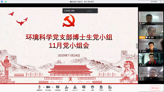11月24日晚上8点,人居学院环境科学支部博士生党小组召开线上党小组会,会议由田野同志主持,党小组全体成员均按时参加会议。
