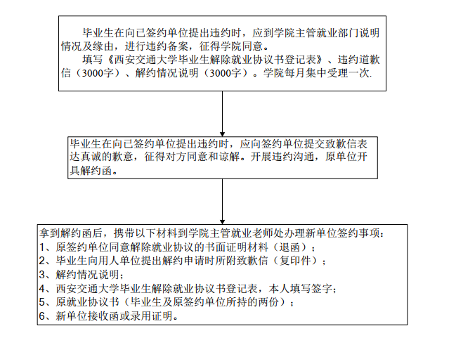 1、办理过违约手续的毕业生,在与新单位签约后,学校不再受理该生的第二次解约申请。