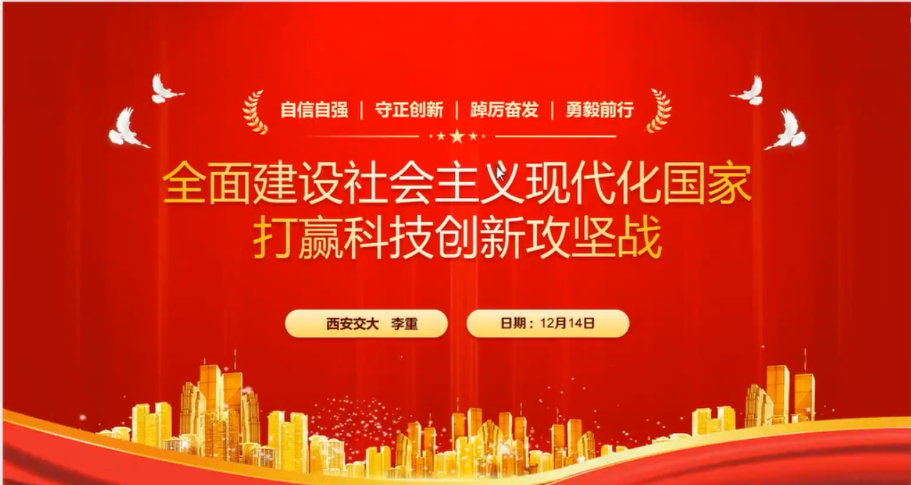 报告会上,李重教授以“全面建设社会主义现代化国家、打赢科技创新攻坚战”为题,立足高校立德树人、助力科技创新的工作实际和工作重点,从二十大报告总体结构、中国式现代化内涵和任务、科技创新与现代化强国建设、担当作为弘扬西迁精神四个部分进行专题报告。重点从近代以来世界发展潮流和中西方现代化的对比角度分析了中国式现代化的深刻内涵和重大意义、新时代中国创新强国实践。以及助力打赢科技攻坚战,交大人在传承弘扬西迁精神中,探索形成的“西交方案”“西交模式”“西交经验”实践思考。强调要在学习党的二十大精神中把握本质、掌握真知,在传承弘扬西迁精神中凝聚奋进力量,实践真知,将学习贯彻党的二十大精神落到实处。
