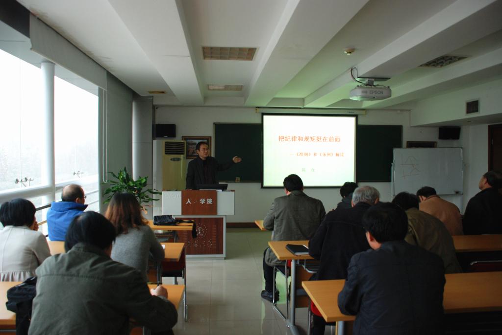 按照学校党委以“明规守纪立德树人”为主题的2015党风廉政建设宣传教育系列活动部署,11月19日下午,人居学院党委邀请校纪委副书记陈红开展题为《把纪律和规矩挺在前面》党风廉政建设专题党课,学院领导、分党委委员、教工党支部书记、各系所负责人、全体教授及副教授参会,会议由分党委副书记冯大鹏主持。