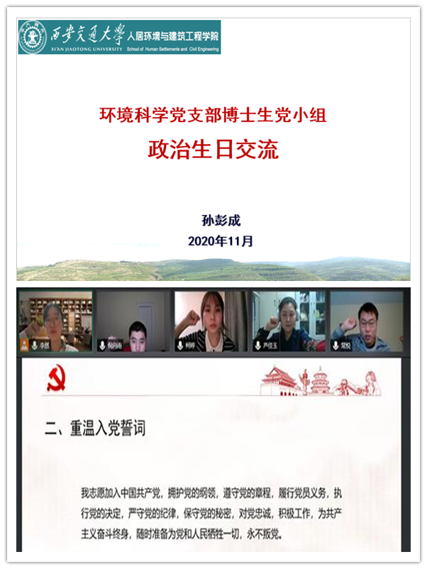环境科学党支部博士生党小组自成立以来,全面贯彻落实“三会一课”制度,努力创新组织生活形式,丰富组织生活内涵,定期组织学习党的理论以及党和国家大政方针,开展党史学习教育,致力于提升党员同志主观能动性和党性修养。支部积极响应党中央和上级要求,利用多种形式和方法推进党史学习教育:以过政治生日的方式回忆入党初心,保持党员的先进性;定期举办读书分享会,通过阅读红色著作解读党的历史;参加报告会以及党史观影等活动,以更直观的方式开展教育。