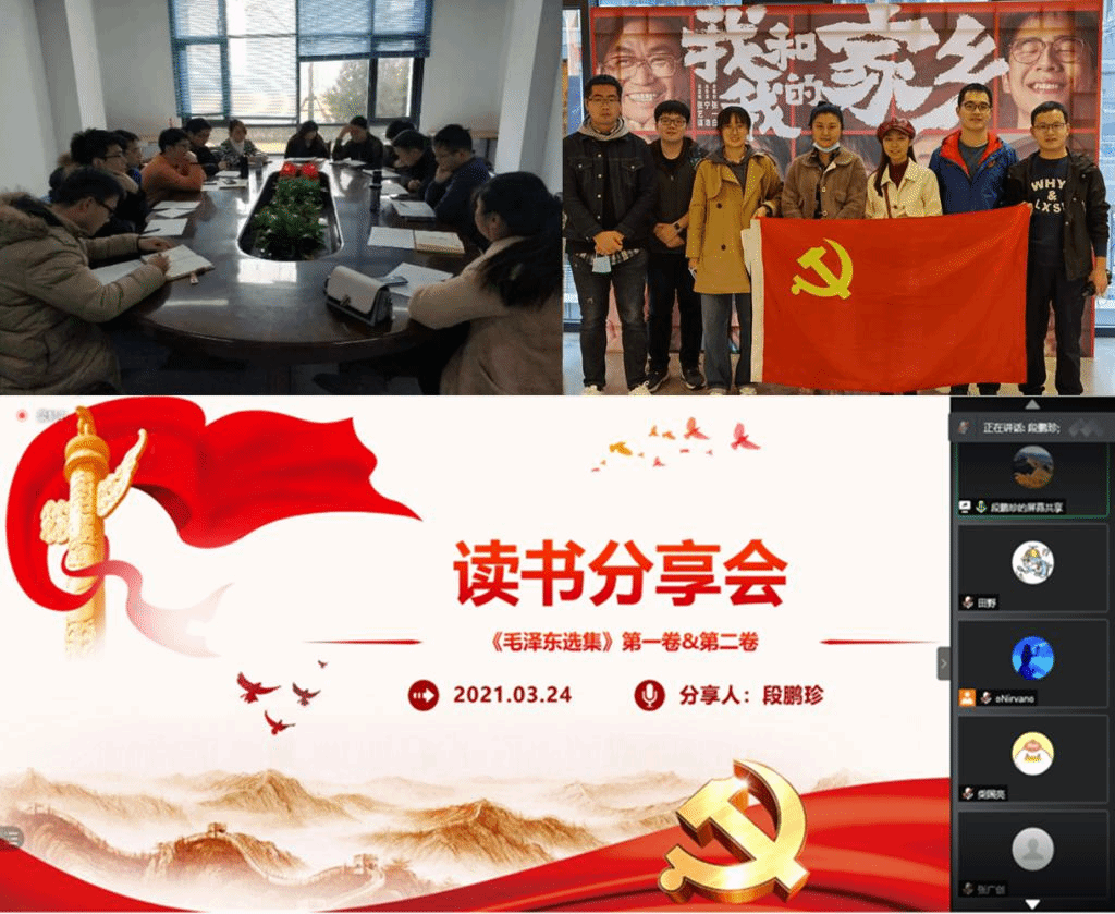党中央召开党史学习教育动员大会以来,支部深入学习贯彻习近平总书记重要讲话精神,博士生党小组坚持开展读书分享会,党小组成员就《共产党宣言》、《毛泽东选集》、《不忘初心:中国共产党为什么能永葆朝气》等内容的阅读情况分享了学习心得,推进党史学习教育在支部顺利开展。分享会上,同志们阐述观点,畅谈体会,读书会上书香弥漫,气氛热烈。读书分享会在重温历史中筑牢担当,推动党史学习教育“走新”更“走心”,让支部党员对党史听得懂、听得进,使党的理论教育入耳、入脑、入心;在学习先锋党员的伟大事迹中传承红色基因,增强了支部党员的党性修养和党性观念。