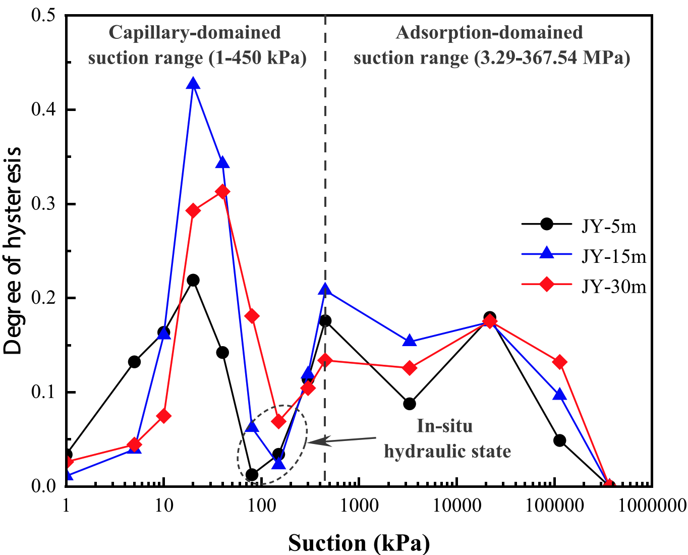 (2)土体滞回特性反映了土体原位的水力状态,且低吸力范围内的滞回特性由毛细作用主导,高吸力范围内的滞回特性由吸附作用主导;