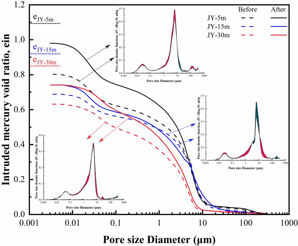 野外条件下的黄土在不同沉积深度下会经历不同的应力历史和水力历史,而不同的应力、水力历史会导致土体持水性质及滞回特性的差异。本研究选取沉积深度分别为5m、15m以及30m的原状黄土进行了全吸力范围内(1-367.5MPa)的持水曲线实验,并分析了高低吸力下黄土呈现不同滞回特性的机理,还通过扫描电子显微镜实验(SEM)及压汞实验(MIP)体现了土体微观结构的变化。此外还利用四个常用的持水模型来模拟全吸力范围内土体的干燥、湿润曲线,通过详细的模拟结果分析了各模型拟合效果。该研究为黄土持水滞后特性动态演变及相关的微观结构的研究提供了支撑。