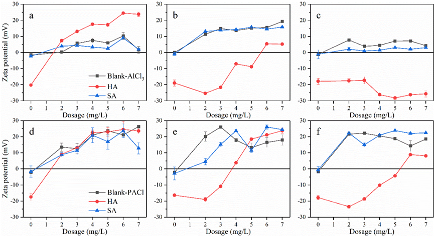 PACl在pH 6(d),7(e)和8(f)形成不同的絮体的Zeta电位