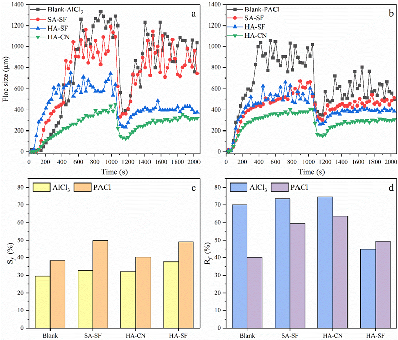 不同工况下形成絮体的Sf (c)和Rf (d)值
