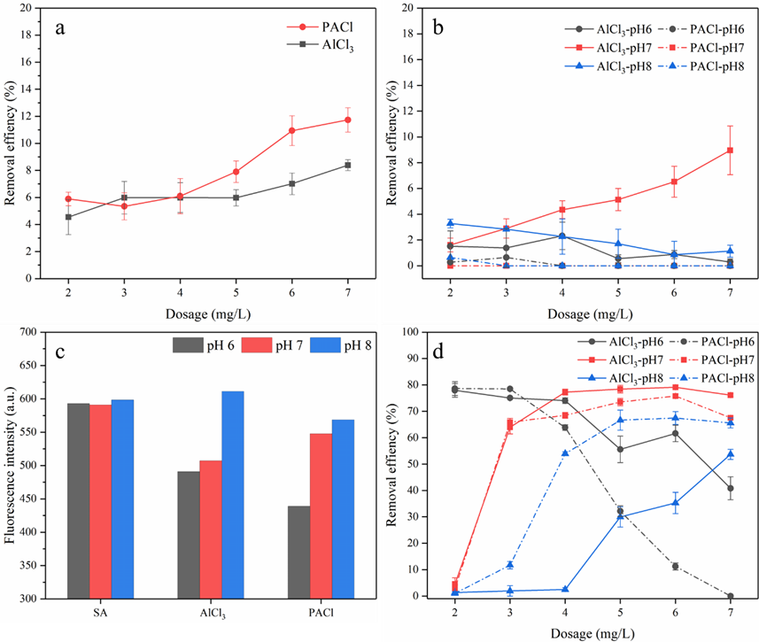 图1 二级出水有机物(a)和水杨酸(b)的混凝去除效果;