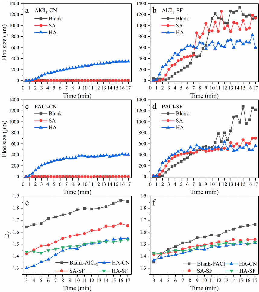 AlCl3(e)和PACl(f)混凝过程中絮体的分形维数变化