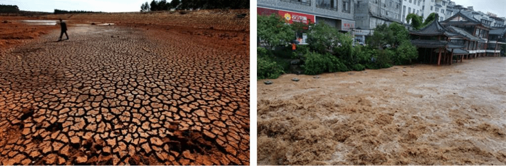 图1 2009/2010年西南地区特大干旱(左图);2020年8月强降雨致河水漫上广西蒙山街道(右图)