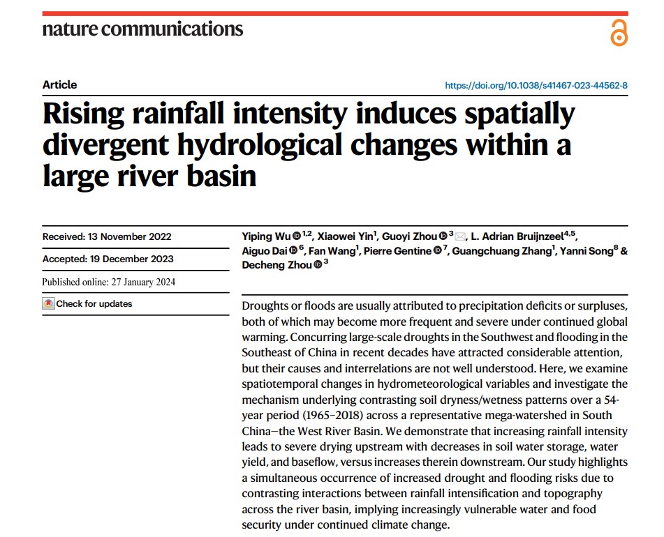 作为珠江流域主体的西江,发源于云贵高原,流经云南、贵州、广西、广东,注入南海。尽管西江流域干旱与洪涝都和降水变化有关,但在流域降水模式变化一致的情况下,为什么干旱与洪涝在上下游却呈现相反的变化趋势?阐明该科学问题的研究论文Rising rainfall intensity induces spatially divergent hydrological changes within a large river basin于2024年1月27日在线发表于《自然通讯》(Nature Communications)上。论文第一作者是西安交通大学吴一平教授,通讯作者是南京信息工程大学周国逸教授,论文第二作者是博士生阴晓伟,西安交通大学全球环境变化研究院为论文第一单位。该研究详细阐述了半个多世纪以来西江流域降水模式的变化特征及干湿演化机制,首次发现了降雨强度和地形相互作用造成了水文变化的空间分异机制,即降雨强度增强同时加剧了西江上游(西南地区)干旱和下游(东南地区)洪涝风险。