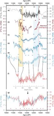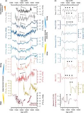 左图:石笋XBL-5的δ18O摇摆匹配。右图:亚洲夏季风在YD内部的联系与差异。