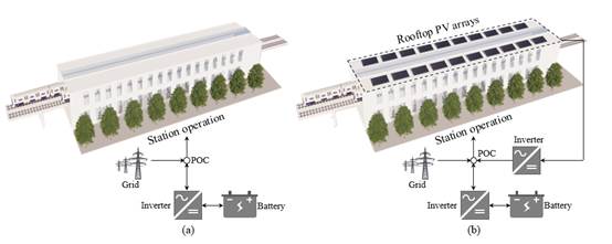 Fig.2. Constrictions and solutions for improving station’s economic performance: (a) with the integration of the energy storage device, and (b) with the integration of the energy storage device and the consolidation of the PV subsystem.