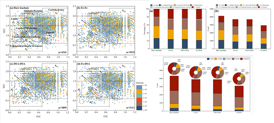 本研究构建了Fe-DSA双阳极配置的电催化氧化工艺(ECO),通过DSA阳极将渗滤液中的Cl-转化为活性氯,活性氯与Fe阳极产生的Fe(OH)3作用原位生成Fe(VI),实现了渗滤液中COD和氨氮的同步高效去除,在最佳条件下,COD去除率达50.94%,氨氮去除率达38.11%(图1)。在Fe-DSA双阳极配置的ECO工艺中,木质素、单宁化合物以及具有生物毒性的含S化合物的转化和去除提高了渗滤液的可生化性(图2和图3)。