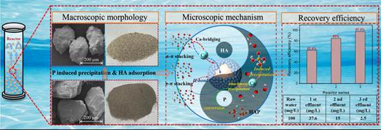 基于对造粒体的进一步分析(FTIR、XRD、SEM-EDS、Roman),结合DFT计算,从分子水平深入剖析了磷回收与有机质同步去除的微观机制;即在专用晶种的诱导作用下,有效降低了羟基磷酸钙在晶种表面的成核能垒,促使废水中的磷主要以羟基磷酸钙的形式附着于晶种表面;与此同时,专用晶种表面的活性基团通过钙离子桥连、Π-Π堆叠以及氢键等多重作用同步捕获有机质,最终形成致密的共聚络合体从水中分离去除。